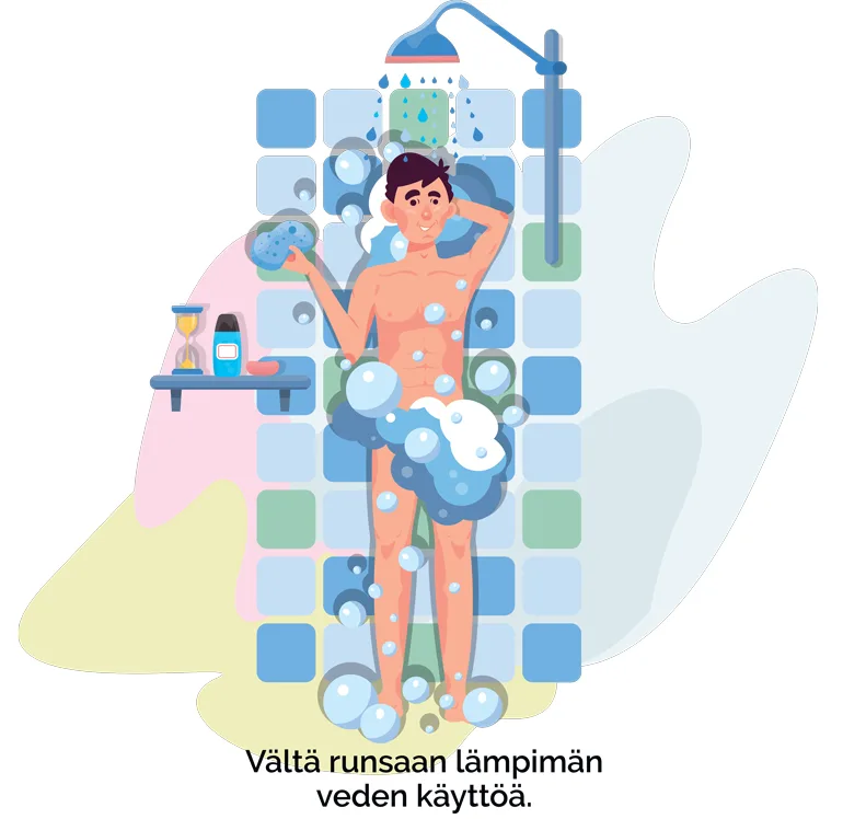 Vältä runsaan lämpimän veden käyttöä. Suosi lyhyitä suihkuja.